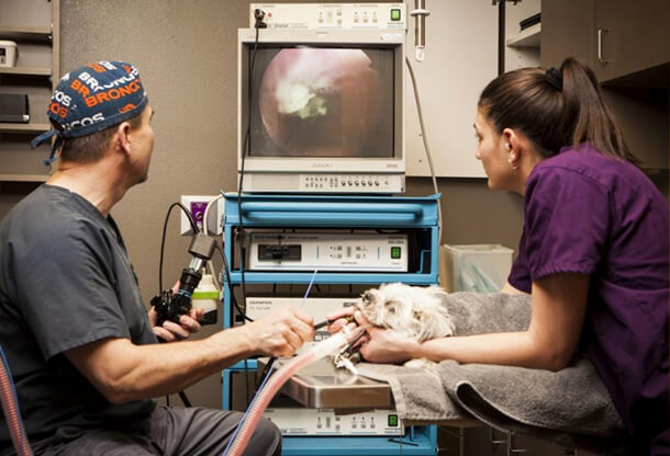 Гастроскопия – информативный метод эндоскопической диагностики, который позволяет ветеринарному врачу оценить состояние слизистой оболочки пищевода, желудка, двенадцатиперстной кишки у собаки. Выполняется гибким эндоскопом с видеокамерой на конце, который вводится через ротовую полость.